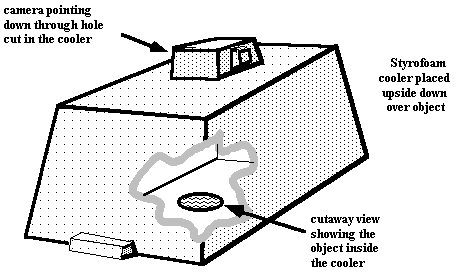 I've heard of people using a Styrofoam cooler from the grocery store as a kind of tent; you can buy them for a couple of dollars, and they work in a similar way to the milk jug, only now you've got a larger object that you stick your camera lens through. Make a round hole in the middle that is a little small for the lens (so the cooler doesn't fall off the lens if you lift it). Styrofoam coolers cut off a lot more light than a milk jug and one has to adjust for this. They're also, like all plastics, susceptible to heat so if you're using photofloods for a light source that's a potential fire hazard. Be careful of melting plastics and fumes!