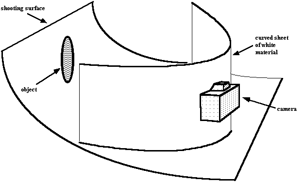 A method that I have not used but that looks quick and easy is to take a large white curving card and stick the camera lens through it to look at the object (Bomback, p 164). If your object was particularly reflective I suspect that you would want a Mylar? 'roof' over the top of the curve to make it into more of a 'tent.' Because the curving white card fixes the camera in place you would have problems eliminating the lens reflection, but there are times I can see this as a good solution to a specific problem.