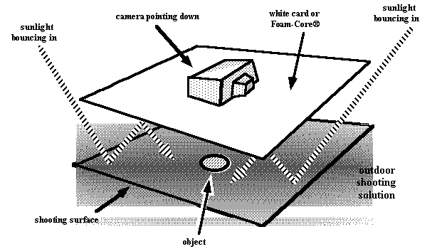 David LaPlantz once described to me a very easy solution for shooting good quality photographs of flatter objects outdoors using daylight film. You take a big white card or Foam - Core? (about 2 - 3 feet square) with the camera lens stuck through a hole in the middle of it and place your shooting surface on the ground outside. You stand leaning over the object which is in the middle of the shooting surface. The light comes in from the sides, bounces back off the ground and the edges of the shooting surface, hits the white underside of the sheet the camera is stuck through, and then bounces back down to the object providing front and side lighting for it with a very smooth and even, nice, white light. I've seen some photographs done like this that you would swear had to have been done on a more complex system.