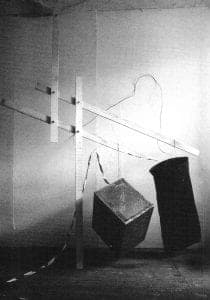 Some of Degen's strongest work is concerned with the relationship of object to body, materials, and theater, vis-à-vis content if not narrative. In 1986 during a residency as a visiting artist in Australia at the South College of Advanced Education, Adelaide, and at Curtin University, Perth, Degen began a series of gloves. The artist has continued the series since then, making a glove or two when an idea presents itself. The idea can be either content or materials driven. In Behind the Wall, there is a door in a wall and behind the wall a hand is trapped. The piece was inspired by a photograph with: "a text of a woman who had been tortured and she heard one of the chaps who was there making a phone call to his wife saying he was a bit delayed and he would be a little bit late at home. That's why in a way that glove came because you don't know what's happening behind the wall."