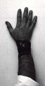 As the vitality of the shadow pieces was dependent upon the wearer moving to change the angle of the shadow, Degen also became interested in the relationship of object to wearer. He made a series of brace lets that are simple wraps of black cotton coated with bee! Wax and graphite that must be wrapped on the wearer's wrist and secured by an assortment of pins, selected by the wearer. The result is a collaboration between maker and wearer. Paul Filmer found that this work was an "extension of the craft of making jewelry into the act of wearing it: a valuable contemporary re-assertion of the consummation of craft in use".