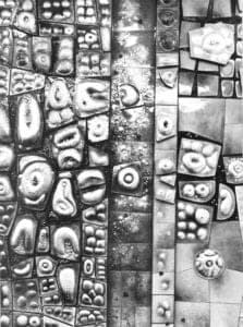 The couples last and largest mural was Variations on a Gold Theme, a 12 foot x 36 foot work over the main entrance to the First National Bank (now Union Bank), in downtown San Diego. The 375 pieces, which fit together to form the mural, incorporated both transparent and opaque enamels as well as patination over repoussé copper. The old alchemists' symbol of gold, a circle with a dot in the center, was used freely throughout the design in conjunction with motifs of ancient and modern coins.