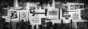 Jackson turned his attention to wood, fiberglass and polyester resin constructions. Bicycling along the waterfront the "rivet patterns, rough over painted surfaces, black flanges and raw color juxtapositions" at the Tenth Avenue Terminal caught his eye. The result was perhaps the strongest work of his long career. Firm linear designs interplay with multiple circles, to anchor the pieces and create movement. Rows of studs introduce change in flat color areas. His few enamels done during that period reflect a similar geometry, with color-over-color abstractions. He also began experimenting with three-dimensional constructions of pierced and scored transparent, acrylic, plastic sheet - free standing small sculptures, hung in layered "window pieces."