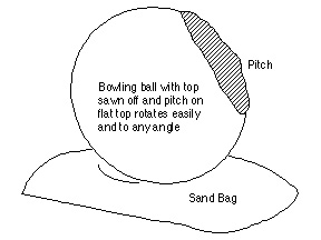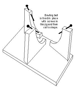 Here is a picture of a jig we have found useful for immobilizing the bolwling ball while band sawing the 1/4 or more off it. You should have an experienced woodworker make the jig and do this cut. The ball is screwed into place in the jig so it cannot move or shift while being cut wiht a band saw.