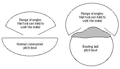 The best pitch holding device for chasing however is a pitch bowl. Unfortunately most commercially supplied pitch bowls are not properly designed, or are simply not heavy enough. A pitch bowl should rotate smoothly to allow easy access from all sides. It should be very heavy (full, but almost totally full of lead is a good start) so that when you chase on the work the bowl does not shift under the blows. As well, there are times when you want to work the metal from the side, almost parallel to the top plane of the bowl, and for this the bowl should be able to be tipped sideways. This means that a hemisphere or flat bowl is no good, and instead you need something even more spherical. An answer: a bowling ball!