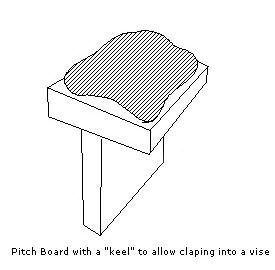 The pitch needs to be spread onto a surface to use it. At its simplest this can be a flat board which sits on or is clamped to a table. For smaller objects pitch is spread onto smaller surfaces, for instance the 8″ length of broom handle that stonesetters use as a pitch stick. I've even seen a blob of pitch on the end of a pencil as a miniature version to hold a tiny metal piece. Sometimes a flat platform attached to a file handle serves as a larger surfaced pitch stick.