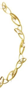 The Simons' chains bear the names Tango, FlickFlack, Flame, Fish or Tulip for a reason. Each of them lives up to the name that it receives: some dance, others flow, with others appearing to burst into bloom, or transmitting the tranquility and harmony of the individual elements. Heike Simons explains the origins of their chain production thus: "After opening our goldsmith workshop in 1995 with work of our own and of other jewelry designers, we soon realized that, in contrast to the large number of rings and bracelets available, there are very few high-quality chains to be found". This provided the incentive for the couple to develop their own collection of chains. From the composition of the alloy to the melting of the metal, the sawing and polishing of the individual elements and the concluding matting or polishing, every single step is performed by master goldsmiths. 18 karat white and yellow gold is used, as well as platinum. The Simons decorate individual elements with brilliants, with some models also ornamented with pearls. 25 different models have already been created in this manner, with an average of two new models added each year, and others removed from the collection. Although individual bracelets and earrings are available to match some models, the primary focus of the two designers lies clearly upon the development and manufacture of chains. On request, Heike and Roland Simon also produce special editions, although this involves a lengthy development process. The easy lightness of Looping and its companions requires a great deal of thought and craftsmanship, involving both the experimental input of the designers and adequate time to prove its value in daily use.