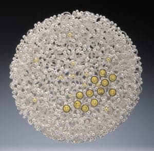 The outer edge of the circle has more layers of Dallae units, making the inner part deeper. This design choice indicates that solitude is a time when I withdraw into myself and grow. I consider the teachings of the Bible to be my backbone, and this piece illustrates the role of religion in my life. That's why I included 12 bi-metal (22k gold and sterling silver) domed disks with 22k gold balls on them in the right lower part of the piece. The number 12 stands for perfection or wholeness in the Bible, representing the12 disciples who learned the true meaning of life through Jesus.