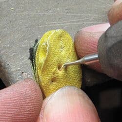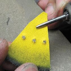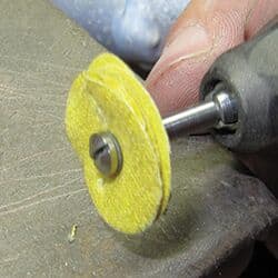 But sometimes, it can be difficult to get into every nook and cranny. To accomplish this, I transform old yellow treated muslin buffs into new smaller versions, perfect for reaching into tight corners. I also cut the buffs into triangle shapes. These two configurations give me the versatility to reach any corner of a piece.