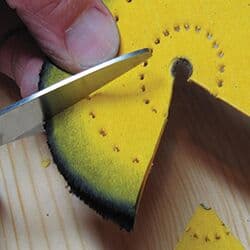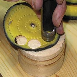I separate the layers of the buff and cut out discs. I can cut up to three layers at a time by using a hollow metal punch I found online. Originally designed to cut leather, the punches come in a set of 12, with sizes ranging from 1/8 to 3/4 of an inch. The punches also work well for cutting out sandpaper discs.