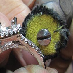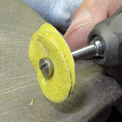 To create triangle buffs, I use scissors to cut out the shapes. I then insert the buff into a split mandrel and use it as if it were sandpaper. I prefer these buffs over brushes because not only are they easier to get into every surface of the piece, but I've also noticed that polishing compound sticks better to the muslin buff material. Also, because these materials have a greater contact area with the metal, they give me better results.