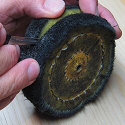 I normally use a 5-inch wheel that has three rows of stitching although any size wheel will work for this project. Before the second row of stitching on the wheel is gone and it is no longer good, I carefully cut the wheel apart using a scalpel knife. I then cut all of the threads that hold the buff together.