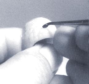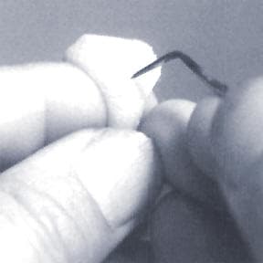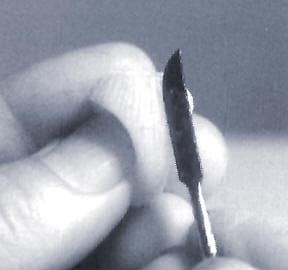 Take a knife modeling tool, heat it lightly and holding at approximately 35°, slice into the wax to the depth of 1 mm. If the tool is too hot, it will only melt the area. You want it warm enough to cut into the wax and be able to push the cut up so the wax would be standing up. Repeat this cutting action in a series of rows to cover the designated area.