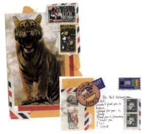 Sigrid Rusch of Montreal, Quebec, Canada sent her "Tiger 1," card to Edward Winter wishing he was here, her "Tiger 2," post card of paper with an attached enameled copper washer implied that she couldn't find me, indicating irony.