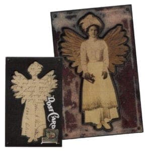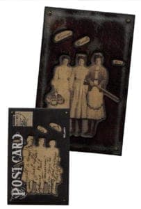 Both of the above had layered, sandwiched construction. "Homer's Surprise" had hanging suspensions, while McLarty's had visual free air suspension of paper collage cut from antique postcards as images for both sides. The backs of both McLarty pieces were in stoned champlevé with paper postage stamps applied. Her nut and bolt assemblage refinements were excellent. That is not to fault anything about "Homer's Surprise," which used glue.