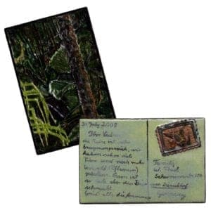 Sixteen participants sent in thirty pieces or 24 postcards and six stamps. While that may seem small, 22 of the postcards were double-sided. That made for 52 pieces on view with connecting content. The concept was restricting as well as economic. The results confirmed individual challenge and purpose.