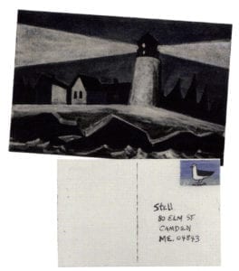 Sixteen participants sent in thirty pieces or 24 postcards and six stamps. While that may seem small, 22 of the postcards were double-sided. That made for 52 pieces on view with connecting content. The concept was restricting as well as economic. The results confirmed individual challenge and purpose.