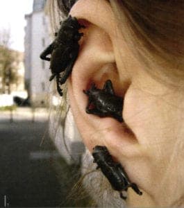 Body art by Eva Dufhues, silver-coated and black crickets