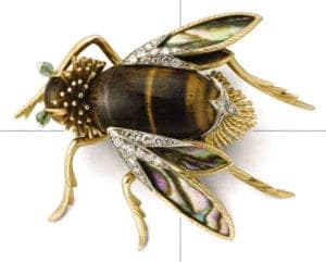 Sterle bee brooch in yellow gold, diamonds, mother of pearl and tiger eye by french designer Lydia Courteille