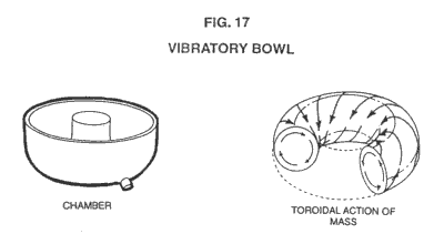 The Vibratory Bowl machine was the next generation of mass finishing and remains the most popular and most effective to date. The processing chamber is the shape of a hollowed doughnut laying on its side. A motor is attached to a shaft with eccentric weights which is fixed to the bowl shaped chamber which is suspended on springs. The ensuing action causes the mass to travel in a three dimensional toroidal motion.