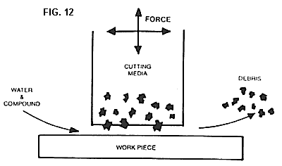 Meanwhile, the bonding material is wearing away so as to rid the media of these dull abrasive grains and to expose new sharp grains to continue the cutting process. The water and compound are used to cushion this effect as well as to remove all of the waste (used abrasive grains, bonding material, work piece surface material) from the operation. Economics now come into play when choosing the proper cutting media.