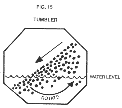 The Tumbling Machine is the oldest form of mass finishing equipment. A motor is attached to the gear box by means of a pulley and belt. The gear box rotates an octagonal finishing chamber which is either submerged in water or contains water in its chamber. The chamber should be loaded with between 50% and 60% of the total chamber volume. About 15% to 25% of the total mass should be work pieces In this equipment, the pieces are only being worked on as the media and pieces tumble down the incline of the rotating barrel. Meanwhile, as the mass rotates up to the top of the incline, there is no movement of media with respect to workpiece; therefore, no work is (D 83 being done. This type of operation is still effective for limited applications with longer time cycles and a low quality finish.