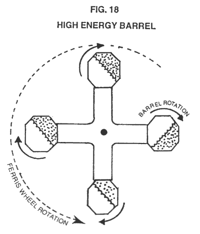 High Energy Barrel Machines operate basically the same as tumbling barrels with one major difference - centrifugal energy is added to the process to dramatically reduce the processing time. This is accomplished by mounting several barrels in a ferris wheel type arrangement and spinning the complete apparatus as each barrel is rotating.