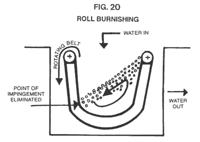 The rough cut is almost always done as a wet operation with media, water and compound. The labor savings is most obvious for cast materials due to the inherent roughness of the "as cast" surface. PRE-FINISHING is the term used for the operation following the rough cut stage. The pre-finishing step is usually done prior to machine polishing, hand polishing or electroplating. The purpose is to increase the smoothness of the "rough cut" surface so as to make the polishing or electroplating procedure more effective. In order for a product to be machine polished or a combination of machine and hand polished, this step is most necessary. If the product is going to be hand polished or electroplated, this step may or may not be necessary. This would depend upon whether the labor saving is worth the time investment. A question quality versus cost must also be taken into consideration. The pre-finishing operation is almost always done as a wet operation with media, water and a compound. MACHINE POLISHING is very economical where applicable. It can save up to 95% of hand finishing labor costs; however, many facto must be considered for this step to be viable. This is usually a dry procedure using a natural carrier and a powdered compound without water. Fig. 4 BURNISHING is used to render the surface of a product bright by J means of rolling over a surface with a non-abrasive media such as steel or porcelain. This method physically peens the surface in order to increase light reflectivity which, in turn, will make the surface appear bright. This media is the heaviest available and is used with water and compound.