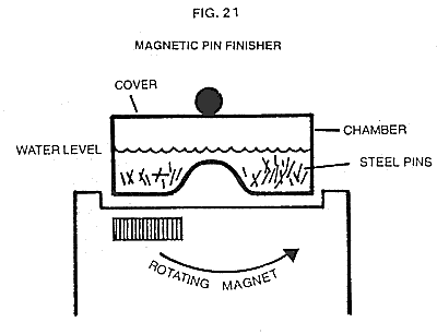 The Magnetic Pin Finisher has been developed to burnish the nooks and crannies and far reaches of jewelry products. The machine uses a motor to spin a magnet beneath a flat table. The finishing chamber contains very fine steel needles or pins with the water and compound mix. The work pieces are placed in the chamber and covered. The cylindrical chamber is placed on top of the table. The magnets are rotated in a circular path that matches the bottom of the chamber. This causes the steel pins to stand up and rotate. The collision of the magnet driven pins with the work piece causes the mass to rotate at the same time as the pins hammer the surface of the work piece.