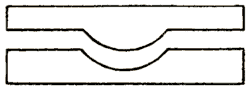 Use the adapted masonite die only when you have gradually sloping curves of large radius, and not too much detail. This is because you have a male die and an outline of the female die, but no female conformity. This inexpensive die is made from a sheet of tempered masonite fastened to '3/4 inch pieces of plywood, with the outline of the piece cut out of the masonite and plywood. For pressing, it is adapted by adding a male die and locating pegs made from large nails. The male die can be sculpted from hardwood such as oak or maple or it can be cut and filed from a thick piece of aluminum or cast in brass, bronze, aluminum or the like. To prevent deterioration of the forming edge of the masonite, a 16 Ga. piece of sheet steel can be cut with a jeweler's saw to produce a template outline, if you wish to produce many units.