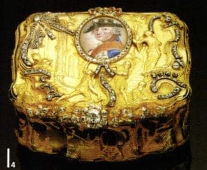 An ordinance in 1700 required a change in materials. At the time in France, no object was allowed to contain more than an ounce of gold. This is why the period featured thimbles made of semi-precious stones, tortoise shell, ivory or fine lacquer. But whatever they loved in Paris was deemed too cheap in Dresden. The art lover August the Strong commissioned his best goldsmiths, stone and ivory cutters in order to create these tiny jewels. It was in fashion at the time to wear the tins visibly on chains to show off one's wares. The era of Rococo was perfect for the development of the magnificent tins. Anyone who thought anything of themselves could not be seen without one of these tins. At times, their production value was astronomical and caused many aristocrats to become avid collectors. Amassing 1,500 valuable pieces, Frederick the Great most probably owned the largest collection at the time. This is astonishing, as the monarch was otherwise seen to be thrifty and even mean.