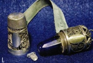 Despite having disappeared from the scene in this hurly burly age of now or never, it is plain to see just how much care and imagination was put into designing thimbles, a utensil for everyday use. This is why thimbles are now coveted collectors' items. They are available in silver, gold and encrusted with enamel and coral, adorned with pearls or turquoise or even with a dome made of agate, mountain crystal, moonstone or amethyst. If that were not enough, we even know of examples made of porcelain - Meißen also produced them -, ivory, horn, tortoise shell, bone, leather or wood.