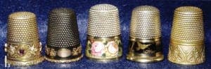 From left to right: Gold with garnet - steel of Toledo with gold-ornaments about 1900 - silver with enamel - tortoiseshell-lacquer-art about 1900, these were ennobled in Japan - gold with 3-colored gold. Manufacturing company Gabler, biggest manufacturer of thimbles in Germany