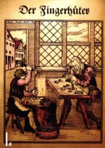 Their fellow tradesmen in Nuremberg were significantly craftier. None other than the famous Paracelsus, who lived for a while with the "thimblers", found out that zinc was what created brass. This paved the way for the production of pure brass. Soon, the whole world was clamoring for thimbles produced in Nuremberg, so, in order to preserve the monopoly, the city banned the thimble makers - now a profession with apprentices, journeymen and masters - from leaving the town. In addition to pretty decorations, the Nuremberg craftsmen also adorned the thimbles with comforting sayings for the seamstresses such as "No thief can steal your love and luck."