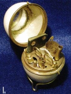 This sewing-kit is accommodated in an egg of a duck and comprises: Thimble, scissors, bottle for smelling, book with pen, needle-can, needle, little tiles for yarn. England, approx. 1850