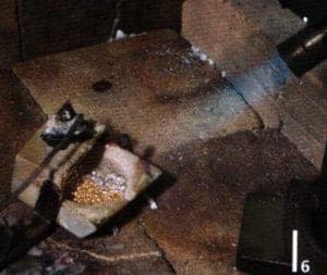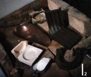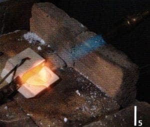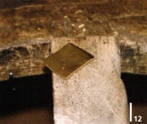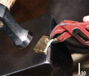 Therefore it is positioned in the crucible pincer, filled with borax powder, heated until the powder melts (Fig. 4 and 5) and panned. The gold and silver is now added to the crucible and covered with flux, borax dust (mixture of borax, potash and common salt) in order to avoid or minimize oxidation and to lower the melting point of the alloy somewhat. The flux is heated carefully, to avoid disruption with boiling over. (Fig. 6) The tongs hold the lid of the crucible in place, enabling the heat to develop quicker inside the crucible. A low-oxygen flame is used for melting in order to avoid oxidation. The copper is only added when the gold and silver have melted. The mold is heated at the same time as the melting of the metal, at least until the condensation on the mold is evaporated (Fig. 7) but not too hot. It is poured quickly to avoid the molten liquid from becoming rigid and to reduce contact with oxygen (Fig. 8). Pincers or a hammer may be used if the metal cannot be removed from the mold. Excess metal forms on the edges of the cast which can be clipped off and rounded off with a file (Fig. 9). The cast is then pickled, removing the hard flux slag. The cast is then best forged with a heavy hammer, rolled and annealed and quenched, thus the metal structure being homogenized (Fig. 10 and 11).