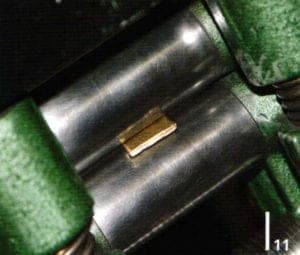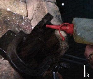 Alloying tools are a firebrick hearth, a ceramic crucible with lid, a mold for wire and sheet, a pan with a spout, crucible pincers and flux powder (Fig 2). The mold is oiled with machine oil in order to provide easier pouring and release of the cast (not too much oil) (Fig 3). With the mold illustrated it is possible to vary sheet or wire widths at will. With new crucibles the spout should be rounded off slightly with a file to facilitate the flow of the metal. For yellow gold and white gold different crucibles have to be used for not to mix components. To prevent the molten precious metal from sticking to the crucible a new ceramic crucible is glazed with melting powder.