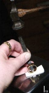 Hallmarking is best performed using a leather underlay to ensure, for example, that a rounded ring band does not acquire a flat point from the steel underlay (Fig. 13). An alloy is generally named after the metal that occurs within it to the greatest extent. An exception may be 333 yellow gold, as here the greatest proportion is not always made up by gold. Internationally accepted alloys are listed on the web site of the World Gold Council**. CIBJO, the international confederation of national jewelry trade organizations, authors "The Blue Books", a set of standards for diamonds, colored gemstones and pearls. In March 2007 the first meeting of the CIBJO Precious Metals Commission took place and the basic parameters for a precious metals "Blue Book" were established. This is an important step toward transparency in the field of international precious metals standards. The necessity for a guide for international precious metals standards is constantly increasing as the markets are growing together.