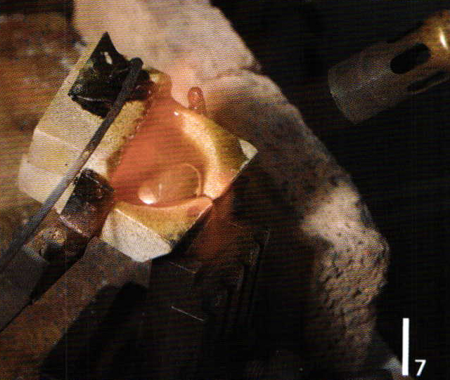 Therefore it is positioned in the crucible pincer, filled with borax powder, heated until the powder melts (Fig. 4 and 5) and panned. The gold and silver is now added to the crucible and covered with flux, borax dust (mixture of borax, potash and common salt) in order to avoid or minimize oxidation and to lower the melting point of the alloy somewhat. The flux is heated carefully, to avoid disruption with boiling over. (Fig. 6) The tongs hold the lid of the crucible in place, enabling the heat to develop quicker inside the crucible. A low-oxygen flame is used for melting in order to avoid oxidation. The copper is only added when the gold and silver have melted. The mold is heated at the same time as the melting of the metal, at least until the condensation on the mold is evaporated (Fig. 7) but not too hot. It is poured quickly to avoid the molten liquid from becoming rigid and to reduce contact with oxygen (Fig. 8). Pincers or a hammer may be used if the metal cannot be removed from the mold. Excess metal forms on the edges of the cast which can be clipped off and rounded off with a file (Fig. 9). The cast is then pickled, removing the hard flux slag. The cast is then best forged with a heavy hammer, rolled and annealed and quenched, thus the metal structure being homogenized (Fig. 10 and 11).