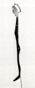 In contrast is the work of Nancy Montgomery. Her planar brooch titled Blue Figure begins to address the idea of narrative through representation. Restrained facial features, motionless gesture and repressed posture, in addition to the simple, straightforward use of material and technique invite contemplation.