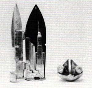 Lanie Todd (Maryland Institute College of Art) entitles her entry Cities in Flight. Composed of a "starship" and a "dust mask," the piece concerns itself with the Earth's future and how some of us will have a means of escape, and others will have to cope with being left behind. This is undoubtedly the most difficult of all the works discussed, both in its conception and its wearability. Conceptually, it deals with sociological psychological fears, big ideas not easily tackled by "the precious realm of body adornment."