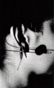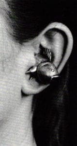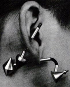 The Fulani people of Mali still make the huge 14k gold, triple-bladed ornaments that have an almost Grand Guignol sense of danger as the weight distends the ear, held by the red silk wrapped piercer. The size and elegance of the silk's menacing gold blades combined with the blood-red silk cannot but stimulate a sense of erotic pain to Western eyes. None of these pieces was easy to wear.