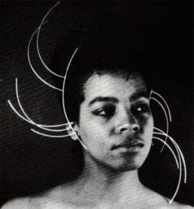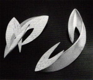 Linda Marie Oliver-Matt's (University of Illinois, Champign-Urbana) huge sculptual ornaments perhaps most reflect those attitudes of the archaic cultures—size, theatricality, commitment to the act of wearing—but this style is thoroughly 20th-century constructivism. She describes her intent as "to encompass not only the ear of the human body but the whole head and face with curvilinear lines. I feel that the simplistic line of the earrings forces the viewer to look not only at the wearer, but also the space around the wearer."