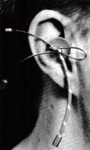 The entries by Jeffrey Saiden (University of Michigan), and Leslie Ott (Center for Creative Studies, Detroit, MI) share similar intent. Visually, they are the simplest pieces of those being discussed. Certainly they could not really be classified as visually intricate. However, I have chosen to include them because of the manner in which they can be worn in the same ear, or in separate ears. This versatility would seem to preclude too much extravagant detail, but rather, necessitates a more open form of design organization.