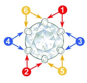 10. After the prongs are bent, Dickey advises using parallel pliers to further secure the gemstone. His technique is to gently squeeze adjacent prongs together following the steps outlined in the diagram.