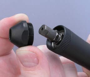 2. To prepare the Foredom #52 handpiece for the Foredom AllSet attachment, I loosen the nose cone of the handpiece with a wrench and remove it.