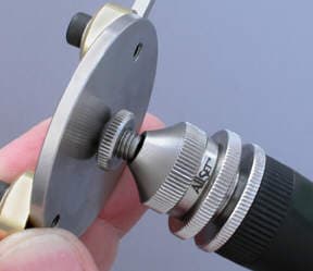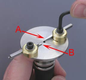 4. Next, I adjust the easy cut prong guide (A) and prong stop (B). The prong guide will support the prong being burred and seldom requires adjustment from job to job. The prong stop is set for the depth of the cut. Use of the prong stop is optional. My goal is to remove about 33 to 40 percent of the prongs total depth.