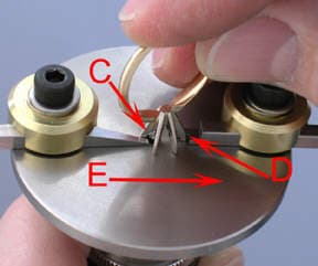 6. I insert the bur into the handpiece and adjust the cutting height. Next, I place the ring, prongs down on the table guide. The prong to be cut is positioned adjacent to the prong guide (C). The opposing prong is positioned against the prong stop (D). I lubricate the bearing bur with bur lubricant and begin to make a cut in the prong by sliding the setting along the prong guides (E). Foredom's series TX Flex Shaft is ideal for this procedure as it provides full torque at a all speeds - notably at a low speed required for this project.