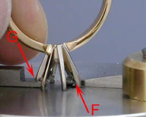 7. As I slide the setting, the prong being cut (F) is supported by the prong guide, which prevents the bur from wrapping around it through the cutting process. The prong stop (G) simultaneously controls the depth of the cut in each prong. This feature is ideal for multiple settings of the same style or when the ultimate precision is mandatory.