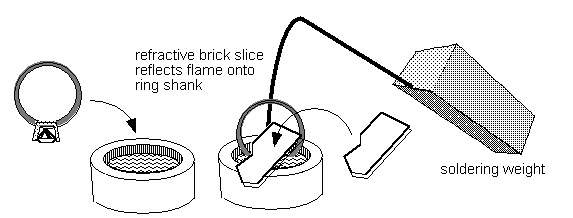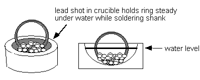 A method of protecting gemstones from heat comes from the shop of Robert and Barbara Kaylor in Boise, Idaho. They use a crucible with lead shot in it to hold the ring steady for soldering. When the ring is positioned correctly in the shot water is added to the crucible to cover and protect the gem. It is important to monitor the water level while heating to ensure it does not go too low, as if it does one has a nasty lead mess on the ring, not to mention potential stone damage. Stainless steel shot would be a good alternative to lead shot, no health problems and no danger of accidentally melting on your piece.